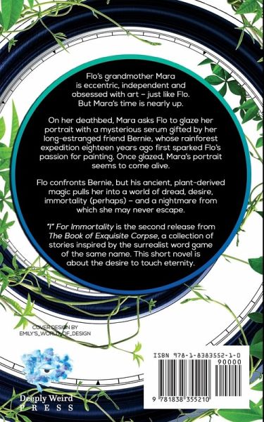 The quest of a true artist is to reach beyond time. But what you find there may change you forever. Flo's grandmother Mara is eccentric, independent and obsessed with art - just like Flo. But Mara's time is nearly up. On her deathbed, Mara asks Flo to glaze her portrait with a mysterious serum gifted by her long-estranged friend Bernie, whose rainforest expedition eighteen years ago first sparked Flo's passion for painting. Once glazed, Mara's portrait seems to come alive. Flo confronts Bernie, but his ancient, plant-derived magic pulls her into a world of dread, desire, immortality (perhaps) - and a nightmare from which she may never escape. "I" For Immortality is the second release from The Book of Exquisite Corpse, a collection of standalone tales inspired by the surrealist word game of the same name. This short novel is about the desire to touch eternity.