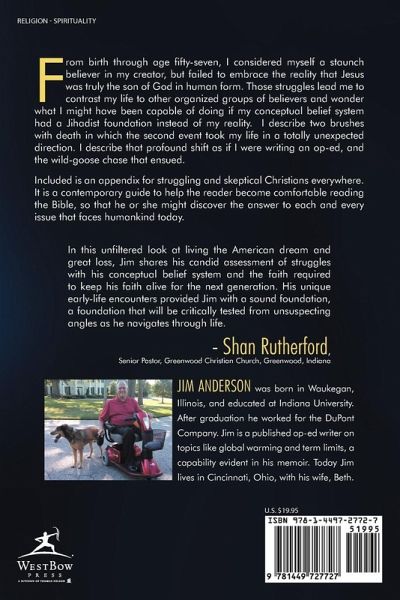From birth through age fifty-seven, I considered myself a staunch believer in my creator, but failed to embrace the reality that Jesus was truly the son of God in human form. Those struggles lead me to contrast my life to other organized groups of believers and wonder what I might have been capable of doing if my conceptual belief system had a Jihadist foundation instead of my reality. I describe two brushes with death in which the second event took my life in a totally unexpected direction. I describe that profound shift as if I were writing an op-ed, and the wild-goose chase that ensued. Included is an appendix for struggling and skeptical Christians everywhere. It is a contemporary guide to help the reader become comfortable reading the Bible, so that he or she might discover the answer to each and every issue that faces humankind today. "In this unfiltered look at living the American dream and great loss, Jim shares his candid assessment of struggles with his conceptual belief system and the faith required to keep his faith alive for the next generation. His unique early-life encounters provided Jim with a sound foundation, a foundation that will be critically tested from unsuspecting angles as he navigates through life." —Shan Rutherford, Senior Pastor, Greenwood Christian Church, Greenwood, Indiana.