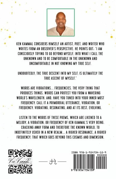 Words are vibrations...frequencies. The very thing that produces things. Words can protect you from a wavering world's wavelength. And, have you tuned into your inner most frequency. Call it a primordial utterance, vibration, or frequency. Vibrating, resonating, and at its best, evolving. Listen to the words of these poems, which are likened to a melody, a vibration, or frequency of Ken Kammal's very Being. Cracking away form and therefore the known world, to indefinitely usher in a new realm...A higher resonance, a higher frequency, that which goes beyond this cosmos and dimension.