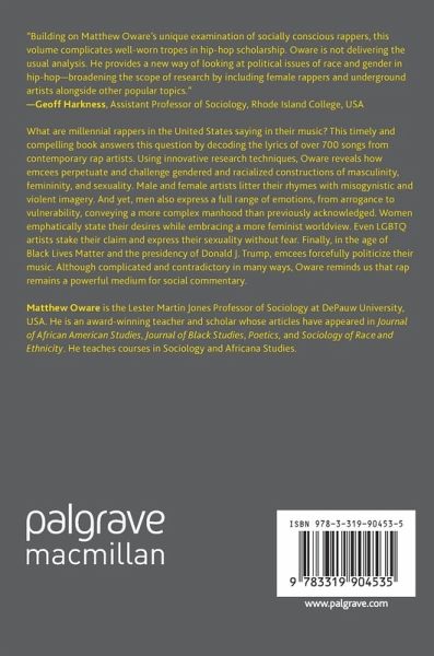 What do millennial rappers in the United States say in their music? This timely and compelling book answers this question by decoding the lyrics of over 700 songs from contemporary rap artists. Using innovative research techniques, Matthew Oware reveals how emcees perpetuate and challenge gendered and racialized constructions of masculinity, femininity, and sexuality. Male and female artists litter their rhymes with misogynistic and violent imagery. However, men also express a full range of emotions, from arrogance to vulnerability, conveying a more complex manhood than previously acknowledged. Women emphatically state their desires while embracing a more feminist approach. Even LGBTQ artists stake their claim and express their sexuality without fear. Finally, in the age of Black Lives Matter and the presidency of Donald J. Trump, emcees forcefully politicize their music. Although complicated and contradictory in many ways, rap remains a powerful medium for social commentary.