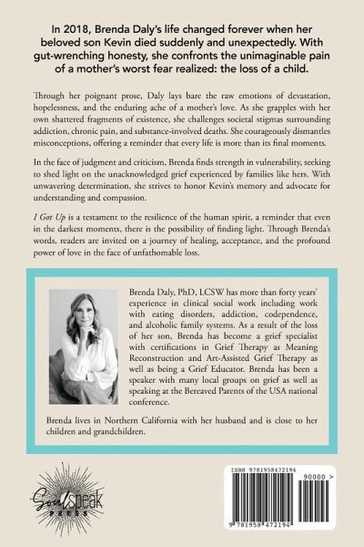 In 2018, Brenda Daly's life changed forever when her beloved son, Kevin, died suddenly and unexpectedly. With gut-wrenching honesty, she confronts the unimaginable pain of a mother's worst fear realized: the loss of a child. Through her poignant prose, Daly lays bare the raw emotions of devastation, hopelessness, and the enduring ache of a mother's love. As she grapples with her own shattered fragments of existence, she challenges societal stigmas surrounding addiction, chronic pain, and substance-involved deaths. She courageously dismantles misconceptions, offering a reminder that every life is more than its final moments. In the face of judgment and criticism, Brenda finds strength in vulnerability, seeking to shed light on the unacknowledged grief experienced by families like hers. With unwavering determination, she strives to honor Kevin's memory and advocate for understanding and compassion. I Got Up is a testament to the resilience of the human spirit, a reminder that even in the darkest moments, there is the possibility of finding light. Through Brenda's words, readers are invited on a journey of healing, acceptance, and the profound power of love in the face of unfathomable loss.