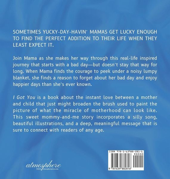 Sometimes yucky-day-havin' mamas get lucky enough to find the perfect addition to their life when they least expect it. Join Mama as she makes her way through this real-life inspired journey that starts with a bad day-but doesn't stay that way for long. When Mama finds the courage to peek under a noisy lumpy blanket, she finds a reason to forget about her bad day and enjoy happier days than she's ever known. I Got You is a book about the instant love between a mother and child that just might broaden the brush used to paint the picture of what the miracle of motherhood can look like. This sweet mommy-and-me story incorporates a silly song, beautiful illustrations, and a deep, meaningful message that is sure to connect with readers of any age.