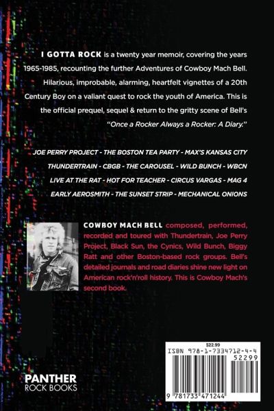 Twenty Years of Tales 1965-1985 Aerosmith's Joe Perry put it this way, "The new singer, Cowboy Mach Bell, was a rock'n'roll guy who grew up in the next town over from me (Holliston, Massachusetts) and had a group called Thundertrain. He loved to rave and be in a band." In his tell-all, journeyman rocker, Cowboy Mach Bell, lead singer with the Joe Perry Project (1982-84),Thundertrain (1974- 80) and the Mechanical Onions opens up about his band's meteoric paths, his favorite rock musicians and how he found himself touring & singing alongside America's quintessential rock star, Joe Perry. This is a Twenty Year 1965-85 memoir and through a series of vignettes, Mach Bell takes readers back to where it all happened: the little tent where he saw the Jimi Hendrix Experience perform; the jail cell he was tossed into after a teenage bust; the Thundertrain mansion and the spot where his first songwriting sessions with Joe Perry took place; the roadhouses and dragways where Thundertrain and the Joe Perry Project headlined nightly; the studios where Once a Rocker Always a Rocker was recorded; and the underground clubs that erupted whenever Mach Bell played. I GOTTA ROCK is packed with never-before-told stories about fans, bands, rockstars, punks, the Sunset Strip, El Mocambo, groupies, backstage, the Rat and the Boston/NYC rock scene's most vital years. Cowboy gives a fresh perspective on 20 years of the most provocative moments in his turbulent rock'n'roll career. Mach Bell also provides a detailed and stunning account of the time he spent on the road employed as a roustabout with Circus Vargas just prior to his joining the Joe Perry Project. Humorous run-ins with excited fans, famous musicians and more than one angry club owner. I Gotta Rock is at once a rocking 60's time capsule of the counterculture in Boston and beyond, a 70's reflection on what it means to find oneself as a rock performer, and an 80's tale of a life lived on the wild side. It's not only a must-read for Cowboy Mach Bell fans, but an essential volume of American pop culture history. I Gotta Rock 492 pages Nearly 200 photographs