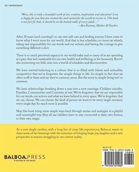 "Wow, this is truly a beautiful work of art, creation, inspiration and education! I am so happy for you that you created this and excited for the world to receive it. This book is not just for kids, it should be on the bedside table of every adult..." -Bex Rasmus, Mother & Teacher. After 20 years (and counting!) on my own self-care and healing journey I have come to know what I want most for our world. And that is less schedules, no more rat wheels, taking real responsibility for our words and our actions, and having the courage to give something different a shot. There is so much perceived urgency in our world today and so many of us are operating at a pace that isn't sustainable for our own health and wellbeing; or for humanity. But it's also immersing our little ones into a world of schedules and disconnection. We have started believing in a culture that is so filled with blame and unhealthy competition that we've forgotten the simple things in life. So simple in fact that we often scoff at them and say they're common sense. But the irony is, simple living isn't so common. We have relationships breaking down a year into a new marriage. Children suicides. Families, Communities and Countries at war. We've forgotten that we are responsible for our words, our actions and what we leave behind in every space. We've forgotten that we can choose. We can choose the kind of person we want to be every single moment, every single day. So much more is possible. May this book bring some simple ways back through stories and analogies in a playful and meaningful way. May all our children learn to stay connected to their own Source, to their own magic.