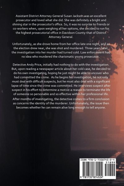 Assistant District Attorney General Susan Jackson was an excellent prosecutor and loved what she did. She was definitely a bright and shining star in the prosecutor's office. So, it was no surprise to friends or co-workers when, upon weighing all her options, she decided to run for the highest prosecutorial office in Davidson Country-that of District Attorney General. Unfortunately, as she drove home from her office late one night, and as the election drew near, she was shot and murdered. Three years later, the investigation into her murder had turned cold. Law enforcement had no idea who murdered the charismatic young prosecutor. Detective Andy Price, initially had nothing to do with the investigation. But, upon reading a newspaper article about her cold case, he decided to do his own investigating, hoping he just might be able to uncover who had committed the crime. As he begins his investigation, he not only must deal with difficult suspects, but he must also deal with a significant lapse of time since the crime was committed. he interviews suspect after suspect in his effort to determine a motive-a reason to terminate the life of someone so personable and so effective within her professional life. After months of investigating, the detective comes to a firm conclusion as concerns the identity of the murderer. Unfortunately, the issue then becomes whether he can remain alive long enough to tell anyone.