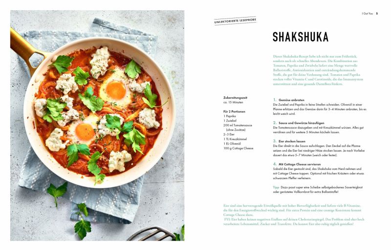 Ernährungswissenschaftlerin und Food-Influencerin Maria Maas zeigt in ihrem ersten Kochbuch, wie einfach und lecker gesunde Ernährung sein kann mit spürbaren Effekten für Darm, Haut und den ganzen Körper. Aus fundiertem Fachwissen, kreativer Kochlust und ihren eigenen Erfahrungen als Betroffene entstand ein einzigartiger Ratgeber voller Genuss und Mehrwert. Egal, ob du unter Akne, Blähbauch oder Reizdarmsyndrom leidest: Unter dem Motto Viel essen, viele Nährstoffe erwarten dich leckere, schnelle und alltagstaugliche Rezepte, die den Nährstoffhaushalt optimieren, die Verdauung sanft unterstützen und Energie schenken. Denn um dein Mikrobiom zu stärken, die Verdauung zu fördern und dein Immunsystem zu unterstützen, braucht es eine vielfältige, bunte Ernährung, die reich an Ballaststoffen, gesunden Fetten und fermentierten Lebensmitteln ist. Von Shakshuka und selbst gemachtem Sauerteigbrot über fluffige Pancakes, ballaststoffreiche Bowls und luftigen Kaiserschmarren bis zu fruchtigen Mango-Kreationen: Alle Gerichte sind ballaststoffreich, frisch, regional und voller Geschmack.