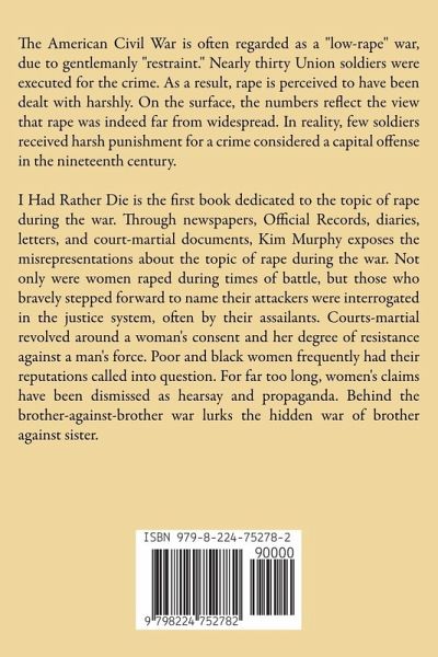 The American Civil War is often regarded as a "low-rape" war, due to gentlemanly "restraint." Nearly thirty Union soldiers were executed for the crime. As a result, rape is perceived to have been dealt with harshly. On the surface, the numbers reflect the view that rape was indeed far from widespread. In reality, few soldiers received harsh punishment for a crime considered a capital offense in the nineteenth century. I Had Rather Die is the first book dedicated to the topic of rape during the war. Through newspapers, Official Records, diaries, letters, and court-martial documents, Kim Murphy exposes the misrepresentations about the topic of rape during the war. Not only were women raped during times of battle, but those who bravely stepped forward to name their attackers were interrogated in the justice system, often by their assailants. Courts-martial revolved around a woman's consent and her degree of resistance against a man's force. Poor and black women frequently had their reputations called into question. For far too long, women's claims have been dismissed as hearsay and propaganda. Behind the brother-against-brother war lurks the hidden war of brother against sister.