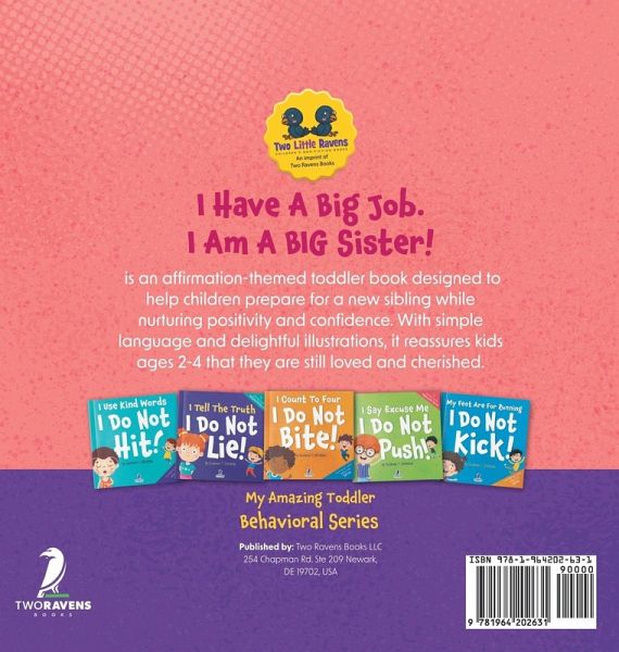 Does your toddler feel unsure about welcoming a new baby into the family? Are you looking for a fun way to foster a strong sibling bond from the very beginning? "I Have A Big Job. I Am A Big Sister!" is the perfect solution, a delightful, affirmation-themed toddler book about getting a new sibling that eases worries and boosts confidence for children ages 2-4. Written to engage curious minds, this book celebrates the transition from being an only child to a proud older sibling. Through simple phrases like "I am a big sister!" and gentle life lessons, such as sharing a favorite teddy or performing silly dances to make Baby giggle, your toddler will learn that being a big sister is both a joyful responsibility and an exciting adventure. Key Features:Encourages Positive Sibling Relationships: Fosters love, kindness, and patience as your little one embraces her new role. Supports Emotional Growth: Validates feelings of jealousy or needing alone time, reassuring children they are still cherished. Builds Confidence & Self-Esteem: Empowering affirmations guide your toddler to become a nurturing helper, reminding her she is loved. Perfect for Ages 2-4: Written with simple language and sweet illustrations to captivate young readers. Ideal for Parents, Teachers, & Guardians: A fantastic tool for classroom and bedtime reading or preparing for a new addition at home. Help your child enjoy a smooth transition into big sisterhood while fostering emotional growth and lifelong sibling bonds. Order your copy now.