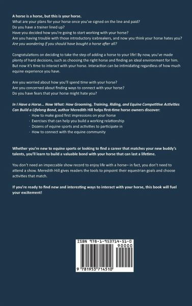 A horse is a horse, but this is your horse. What are your plans for your horse once you've signed on the line and paid? Do you have a trainer lined up? Have you decided how you're going to start working with your horse? Are you having trouble with those introductory icebreakers, and now you think your horse hates you? Are you wondering if you should have bought a horse after all? Congratulations on deciding to take the step of adding a horse to your life! By now, you've made plenty of hard decisions, such as choosing the right horse and finding an ideal environment for him. But now it's time to interact with your horse. Interaction can be intimidating regardless of how much equine experience you have. Are you worried about how you'll spend time with your horse? Are you concerned about finding ways to connect with your horse? Do you have fears that your horse might hate you? In I Have a Horse... Now What: How Grooming, Training, Riding, and Equine Competitive Activities Can Build a Lifelong Bond, author Meredith Hill helps first-time horse owners discover: · How to make good first impressions on your horse · Exercises that can help you build a working relationship · Dozens of equine sports and activities to participate in · How to connect with the equine community Whether you're new to equine sports or looking to find a career that matches your new buddy's talents, you'll learn to build a valuable bond with your horse that can last a lifetime. You don't need an impeccable show record to enjoy life with a horse- in fact, you don't need to attend a show. Meredith Hill gives readers the tools to pinpoint their equestrian goals and choose activities that match. If you're ready to find new and interesting ways to interact with your horse, this book will fuel your excitement!