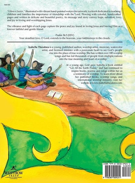 "I Have a Savior," illustrated with vibrant hand-painted watercolor artwork, is a book dedicated to teaching children and families the importance of friendship with the Lord. Flowing with colorful, handcrafted pages and written in delicate and beautiful poetry, its message and story convey hope, salvation, love, and joy in loving and worshipping Jesus. The vibrance and light of each page capture the peace and joy found in loving Jesus and having Him as a forever faithful and gentle friend. Psalm 36:5 (ESV) Your steadfast love, O Lord, extends to the heavens, your faithfulness to the clouds.