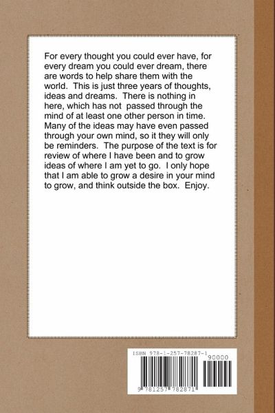 A creative reading experience; the idea behind reading the book, is that a person can sit and read for thirty minutes or less and then go about with new ideas passing through their mind during the day. Each entry is a thought or group of thoughts that are intended to bring out the greater levels of wonder from within your mind. Many ideas come from a mixing of modern concepts with views from classic religions, creating a strange spirituality; often stretching far outside the box of normal thoughts, this book takes you on a walk through the mind of a man who enjoys making people wonder, "Where in the world did he come up with that?" From dream states to atomic landscapes you will find this book funny, spiritually uplifting and at times baffling to the senses. This is more than a journal of "What I did today." It is a journal of what comes to mind while one attempts to tear down and rebuild the universe in their head, under the assumption that this will help them to understand God.