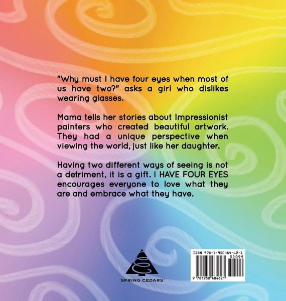 "Why must I have four eyes when most of us have two?" asks a little girl who dislikes wearing glasses. Mama tells her stories about Impressionist painters who created beautiful artwork. They had a unique perspective when viewing the world, just like her daughter. Having two different ways of seeing is not a detriment, it is a gift. I Have Four Eyes encourages everyone to love what they are and embrace what they have.
