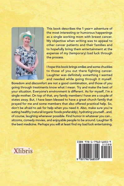 This book describes the 1 year+ adventure of the most interesting or humorous happenings as a single working mom with breast cancer. My objective when writing was to appeal to other cancer patients and their families and to hopefully bring them entertainment at the expense of my (temporary) bad luck through the process. _________________ I hope this book brings smiles and some chuckles to those of you out there fighting cancer. Laughter was definitely something I wanted and needed while going through it myself. Boredom and discomfort are not a good combination, and those of you going through treatments know what I mean. Try and make the best of your situation. Everyone's environment is different. As for myself, I'm a single mother. On top of that, any family members I have are a couple of states away. But, I have been blessed to have a great church family that prayed for me and some members that also offered practical help. So, don't be afraid to ask for help when you need it. Also, make sure you're eating healthy (natural/organic foods preferably), hydrating yourself...and, of course, laughing whenever possible. Find humor in whatever you can...sitcoms, comedy movies, and enjoyable people to be around. Laughter IS the best medicine. Perhaps you will at least find my bad luck entertaining.