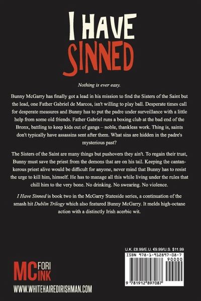 Nothing is ever easy. Bunny McGarry is a man on a mission. He left his life in Ireland behind to come to New York to find the woman he loves, who has a lot of very dangerous people looking for her. Unfortunately, Bunny doesn’t know where she is either and the only ones who might are a rogue order of nuns called The Sisters of the Saint who have raised not being found to the level of art form. Bunny’s one clue is a priest who he thinks might know something, but Father Gabriel de Marcos isn’t willing to play ball. The padre runs a boxing club at the bad end of the Bronx, battling to keep kids out of gangs – noble, thankless work. Thing is, saints don’t typically have assassins sent after them. What sins are hidden in the padre’s mysterious past? Bunny has no choice but to save Gabriel from the demons that are on his tail. He has to manage all this while living under the rules that chill him to the very bone. No drinking. No swearing. No violence. I Have Sinned is book two in the McGarry Stateside series, a continuation of the smash hit Dublin Trilogy which also featured Bunny McGarry. It melds high-octane action with a distinctly Irish acerbic wit.