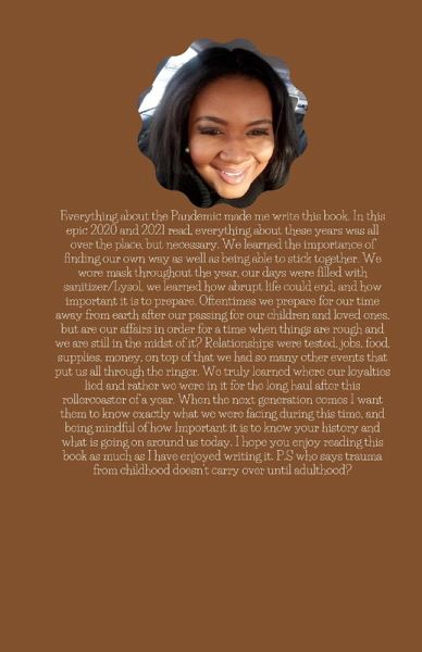Everything about the Pandemic made me write this book. In this epic 2020 and 2021 read, everything about these years was all over the place, but necessary. We learned the importance of finding our own way as well as being able to stick together. We wore mask throughout the year, our days were filled with sanitizer/Lysol, we learned how abrupt life could end, and how important it is to prepare. Oftentimes we prepare for our time away from earth after our passing for our children and loved ones, but are our affairs in order for a time when things are rough and we are still in the midst of it? Relationships were tested, jobs, food, supplies, money, on top of that we had so many other events that put us all through the ringer. We truly learned where our loyalties lied and rather we were in it for the long haul after this rollercoaster of a year. When the next generation comes I want them to know exactly what we were facing during this time, and being mindful of how Important it is to know your history and what is going on around us today. I hope you enjoy reading this book as much as I have enjoyed writing it. P.S who says trauma from childhood doesn't carry over until adulthood?