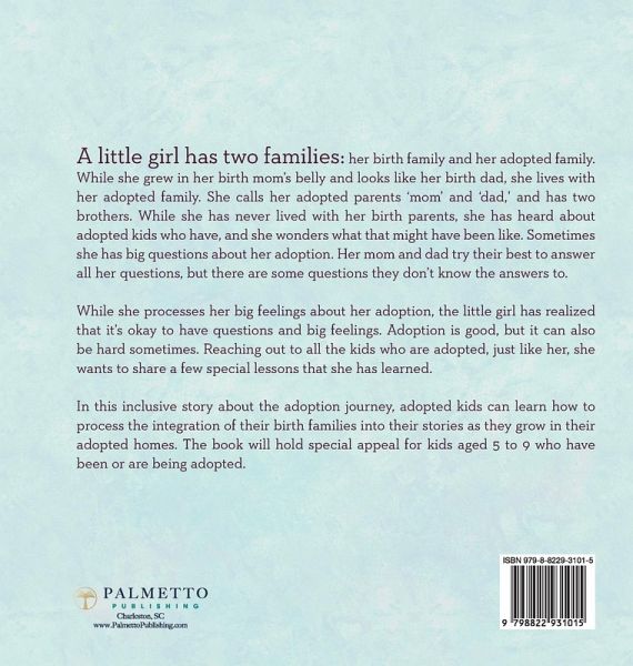 A little girl has two families: her birth family and the family that adopted her. She has many questions and feelings about her adoption. Together with her two families, she shares her story with other adopted kids. A little girl shares her unique adoption story with other kids who may be adopted or about to be adopted. She grew in her birth mom's belly and looks like her birth dad, but she grew in the hearts of her adopted family and lives with them. She often has questions about her adoption that her adopted parents try their best to answer. In this inclusive book about the adoption journey, kids can learn they are amazing, chosen, and loved. I Have Two Families is the perfect gift for children aged 5 to 9 who have been through adoption or who are going to be adopted. Written with love by a licensed marriage and family therapist who has both professional and personal experience with adoption, I Have Two Families offers kids a relatable look at open adoption. Parents and caregivers can use the book to help start conversations about what it means to be adopted and how to process all the big questions and feelings that kids may have about their own adoption.