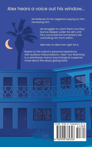 A riveting first-person dive into the mind of a voice-hearer, based on the author's personal experience. "...this novel is utterly unique and, from a certain perspective, absolutely terrifying." - Goodreads review ¿¿¿¿¿ "A gripping page turner. You won't put it down." - Amazon review ¿¿¿¿¿ "The honesty of the author's story telling is disarming, uncomfortable at times, absolutely poetic, and profoundly human." - Goodreads review ¿¿¿¿¿ Alex hears a voice out his window. He believes it's his neighbors spying on him. Harassing him. Are they skilled hackers? Government agents targeting him for a secret social experiment? Are his friends in on it? The girl he met online? The police? He'll turn his apartment upside-down to find their observation equipment. Search his own body for microchips. Confront his neighbors face-to-face. Will he hurt the only person who can help him? Little does Alex know, the true culprit is much closer to home. Based on the author's personal experience with auditory hallucinations, I Hear You Watching is a relentlessly interior psychological suspense novel about the abyss gazing back. "A deep, soul-pulling dive with a satisfying end." - Amazon review ¿¿¿¿¿ "It distills the experience of social anxiety and paranoia in such a harrowing and palpable way." - Amazon review ¿¿¿¿¿ "Looking over the shoulder and through the eyes of our bewildered, then panicked, always exhausted and grimly resolute narrator, I triumphed as he found little ways to win, or to lose with some human dignity." - Goodreads review ¿¿¿¿¿