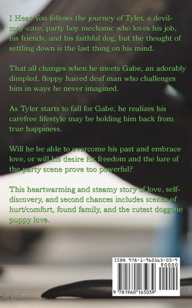 I Hear You follows the journey of Tyler, a devil-may-care, party boy mechanic who loves his job, his friends, and his faithful dog, but the thought of settling down is the last thing on his mind. That all changes when he meets Gabe, an adorably dimpled, floppy haired deaf man who challenges him in ways he never imagined. As Tyler starts to fall for Gabe, he realizes his carefree lifestyle may be holding him back from true happiness. Will he be able to overcome his past and embrace love, or will his desire for freedom and the lure of the party scene prove too powerful? This heartwarming and steamy story of love, self-discovery, and second chances includes scenes of hurt/comfort, found family, and the cutest doggone puppy love. It is a must-read for mm romance fans.