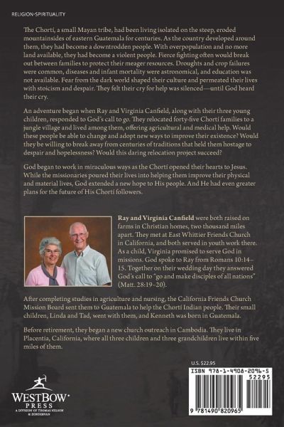 The Chortí, a small Mayan tribe, had been living isolated on the steep, eroded mountainsides of eastern Guatemala for centuries. As the country developed around them, they had become a downtrodden people. With overpopulation and no more land available, they had become a violent people. Fierce fighting often would break out between families to protect their meager resources. Droughts and crop failures were common, diseases and infant mortality were astronomical, and education was not available. Fear from the dark world shaped their culture and permeated their lives with stoicism and despair. They felt their cry for help was silenced—until God heard their cry. An adventure began when Ray and Virginia Canfield, along with their three young children, responded to God’s call to go. They relocated forty-five Chortí families to a jungle village and lived among them, offering agricultural and medical help. Would these people be able to change and adopt new ways to improve their existence? Would they be willing to break away from centuries of traditions that held them hostage to despair and hopelessness? Would this daring relocation project succeed? God began to work in miraculous ways as the Chortí opened their hearts to Jesus. While the missionaries poured their lives into helping them improve their physical and material lives, God extended a new hope to His people. And He had even greater plans for the future of His Chortí followers.
