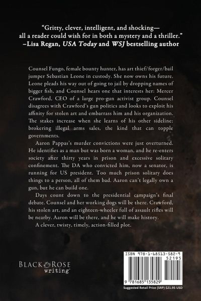 "Gritty, clever, intelligent, and shocking-all a reader could wish for in both a mystery and a thriller." -Lisa Regan, USA Today and WSJ bestselling author "A high-stakes art sting in play and an assassination in progress. Chris Bauer humanizes unique, frenzied, marginalized characters in a twisty and timely page turner." - Robert Dugoni, NYT bestselling author of The Tracy Crosswhite series Counsel Fungo, female bounty hunter, has art thief/forger/bail jumper Sebastian Leone in custody. She now owns his future. Leone pleads his way out of going to jail by dropping names of bigger fish, and Counsel hears one that interests her: Mercer Crawford, CEO of a large pro-gun activist group. Counsel disagrees with Crawford's gun politics and looks to exploit his affinity for stolen art and embarrass him and his organization. The stakes increase when she learns of his other sideline: brokering illegal arms sales, the kind that can topple governments. Aaron Pappas's murder convictions were just overturned. He identifies as a man but was born a woman, and he re-enters society after thirty years in prison and excessive solitary confinement. The DA who convicted him, now a senator, is running for US president. Too much prison solitary does things to a person, all of them bad. Aaron can't legally own a gun, but he can build one. Days count down to the presidential campaign's final debate. Counsel and her working dogs will be there. Crawford, his stolen art, and an eighteen-wheeler full of assault rifles will be nearby. Aaron will be there, and he will make history. A clever, twisty, timely, action-filled plot.