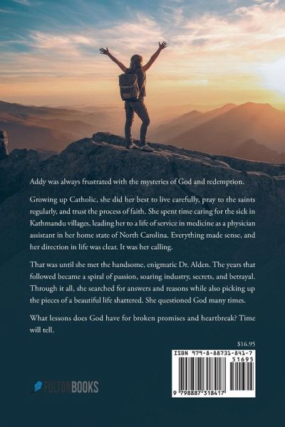 Addy was always frustrated with the mysteries of God and redemption. Growing up Catholic, she did her best to live carefully, pray to the saints regularly, and trust the process of faith. She spent time caring for the sick in Kathmandu villages, leading her to a life of service in medicine as a physician assistant in her home state of North Carolina. Everything made sense, and her direction in life was clear. It was her calling. That was until she met the handsome, enigmatic Dr. Alden. The years that followed became a spiral of passion, soaring industry, secrets, and betrayal. Through it all, she searched for answers and reasons while also picking up the pieces of a beautiful life shattered. She questioned God many times. What lessons does God have for broken promises and heartbreak? Time will tell.