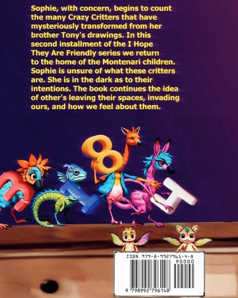 Sophie with concern, begins to count the many Crazy Critters that have mysteriously transformed from her brother Tony's drawings. In the I Hope They Are Friendly series we return to the home of the Montenari children. Sophie is unsure of what these critters are. She is in the dark as to their intentions. The book continues the idea of others leaving their spaces, invading ours, and how we feel about them.
