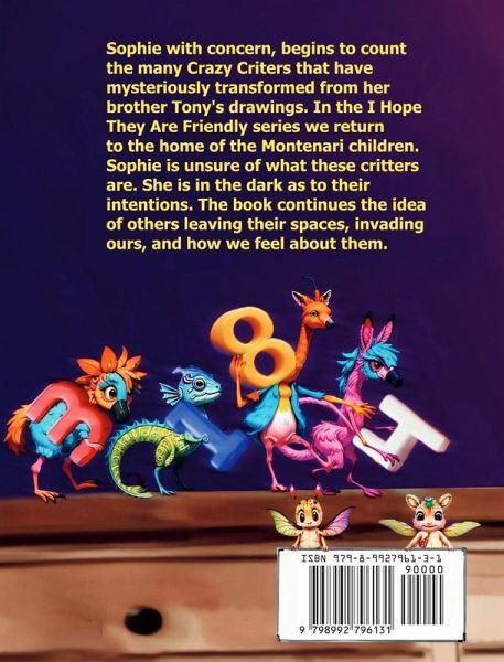 Sophie with concern, begins to count the many Crazy Critters that have mysteriously transformed from her brother Tony's drawings. In the I Hope They Are Friendly series we return to the home of the Montenari children. Sophie is unsure of what these critters are. She is in the dark as to their intentions. The book continues the idea of others leaving their spaces, invading ours, and how we feel about them.