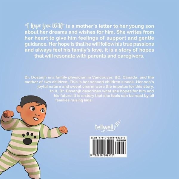 "I Hope You Will" is a mother's letter to her young son about her dreams and wishes for him. She writes from her heart to give him feelings of support and gentle guidance. Her hope is that he will follow his true passions and always feel his family's love. It is a story of hopes that will resonate with parents and caregivers.