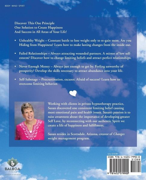 Discover This One Principle One Solution to Create Happiness And Success in All Areas of Your Life! • Unhealthy Weight - Constant battle to lose weight only to re-gain more. Are you Hiding from Happiness? Learn how to make lasting changes from the inside out. • Failed Relationships - Always attracting wounded partners. A mirror of low self-esteem? Discover how to change limiting beliefs and attract perfect relationships. • Never Enough Money - Always just enough to get by. Feeling unworthy of prosperity? Develop the skills necessary to attract abundance into your life. • Self-Sabotage - Procrastination, excuses. Afraid of success? Learn how to overcome limiting behavior.