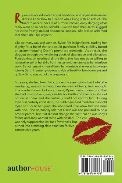 Rylee was not educated about emotional and physical abuse nor did she know how to function while living with an addict. She tried to accept her life of turmoil, conveniently denying what really went on in her household. Like the time that Darth slugged her in the freshly stapled abdominal incision. She was so ashamed that she didn't tell anyone. Like so many abused women, Rylee felt insignificant, trading her dignity for a belief that she could purchase family stability based on accommodating Darth's perverted demands. As a result, she slogged through overwhelming bouts of depression and alienation. Functioning on overload all the time, she had not been willing to remove herself or her child from her commitment to make her marriage work. By not removing herself from her marriage, she was unknowingly joining Darth in a merry-go-round ride of hostility, bewilderment and guilt, with no way out of the playground. For years, she had been living under the assumption that if what she was trying, was not working then she was not trying hard enough. In a pivotal moment of acceptance, Rylee finally understood that she had to stop being responsible for Darth's problems as she did not cause them, and she certainly could not control him. During their first custody court date, the mild-mannered mediator man told Rylee to stick to her guns, she wondered if he knew that she slept with one. She personally felt that Darth was too polluted to be a proper parent, but that did not change the fact that he was Joey's father, and Joey wanted to be with his dad. The visit was only supposed to last for a few weeks, but turned into a missing child situation for five consecutive years.