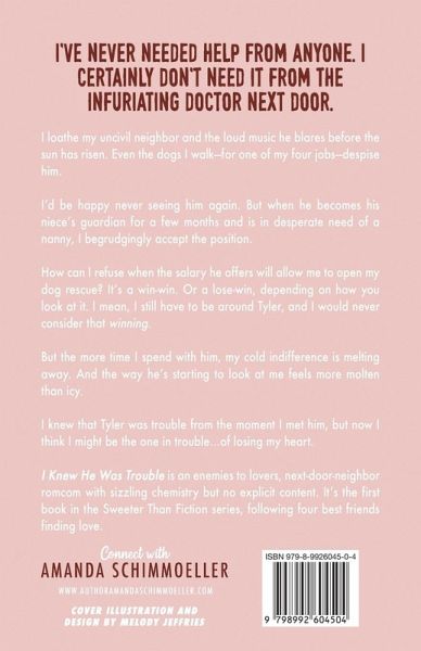 I've never needed help from anyone. I certainly don't need it from the infuriating doctor next door. I loathe my uncivil neighbor and the loud music he blares before the sun has risen. Even the dogs I walk-for one of my four jobs-despise him. I'd be happy never seeing him again. But when he becomes his niece's guardian for a few months and is in desperate need of a nanny, I begrudgingly accept the position. How can I refuse when the salary he offers will allow me to open my dog rescue? It's a win-win. Or a lose-win, depending on how you look at it. I mean, I still have to be around Tyler, and I would never consider that winning. But the more time I spend with him, my cold indifference is melting away. And the way he's starting to look at me feels more molten than icy. I knew that Tyler was trouble from the moment I met him, but now I think I might be the one in trouble...of losing my heart. I Knew He Was Trouble is an enemies to lovers, next-door-neighbor romcom with sizzling chemistry but no explicit content. It's the first book in the Sweeter Than Fiction series, following four best friends finding love.
