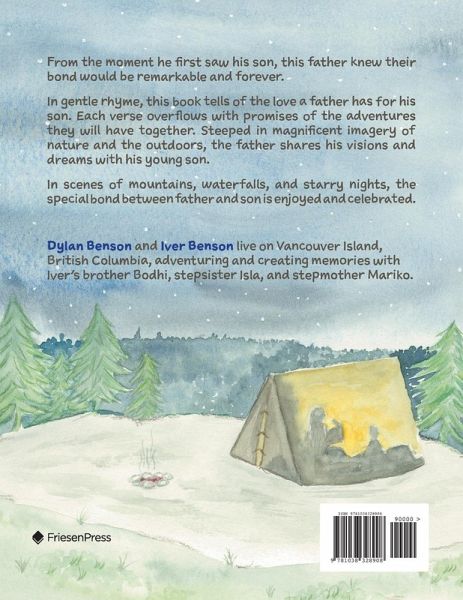 From the moment he first saw his son, this father knew their bond would be remarkable and forever. In gentle rhyme, this book tells of the love a father has for his son. Each verse overflows with promises of the adventures they will have together. Steeped in magnificent imagery of nature and the outdoors, the father shares his visions and dreams with his young son. In scenes of mountains, waterfalls, and starry nights, the special bond between father and son is enjoyed and celebrated.