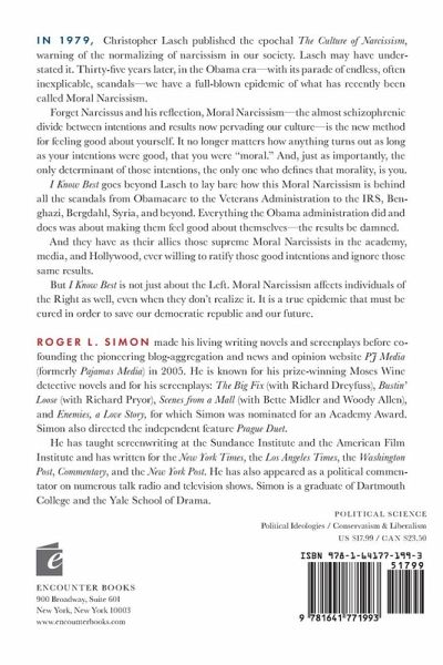 Do you want to know who is largely responsible for the decline of America in the last half century? And do you want to know why? Roger Simon has written the answer in an original and significant book. He may have even coined a term that will become part of the American lexicon: Moral Narcissism. Few will agree with everything he has written. But so what? He forces you to thinknot just feel. This is precisely what we need. Dennis Prager, nationally syndicated talk radio host, columnist, and New York Timesbestselling author Roger L. Simon's riveting I Know Best fires a bullet into the heart of political correctness. In his inimitable style, he exposes the insufferable Moral Narcissism that is tearing our society apart. David Limbaugh, political commentator and author of The Emmaus Code The race card players and hustlers don't want a color-blind society, they want a color coordinated one as long as they do the coordinating. Roger's book offers a welcome and needed perspective on the game that hurts the very people these leftists-hustlers claim to care about. Larry Elder, national talk show host with the Salem Radio Network and author of What's Race Got to Do with It? Simon perceptively shows how elite self-regard drives today's destructive race politics, among other contemporary pathologies. His fresh analysis of President Barack Obama's response to the Trayvon Martin case was a revelation. Heather Mac Donald, Thomas W. Smith Fellow at the Manhattan Institute