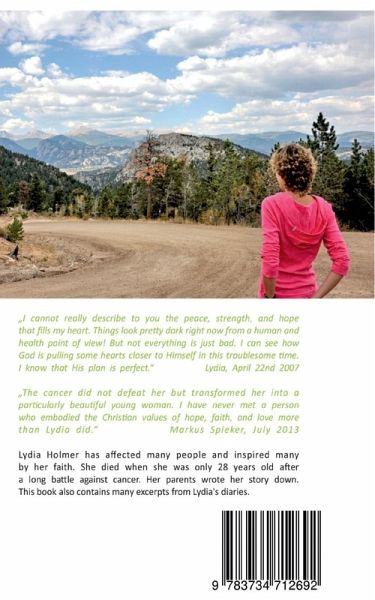 I know God´s Plan is Perfect - Dear Lord, why? Lydia - a girl full of love for life, the people she met and Jesus ... How could God allow a mere 28 year old to die after battling a difficult illness? She had an incredible willpower during her life and even in sickness. Even though she loved her childhood home so incredibly much, she didn't only spent a year in Aidlingen and became a pediatric nurse in Stuttgart, but followed God's calling to the Torchbearers in Sweden and later on to a children's home in El Salvador. There she was tormented by pain in her pelvis. A tumor! A long road of suffering began. But in her joy and deep grounded faith up until death she was and still is a big role model to many people to this day.Lydia Holmer has affected many people and inspired many by her faith. She died when she was only 28 years old after a long battle against cancer. Her parents wrote her story down. This book also contains many excerpts from Lydia's diaries.