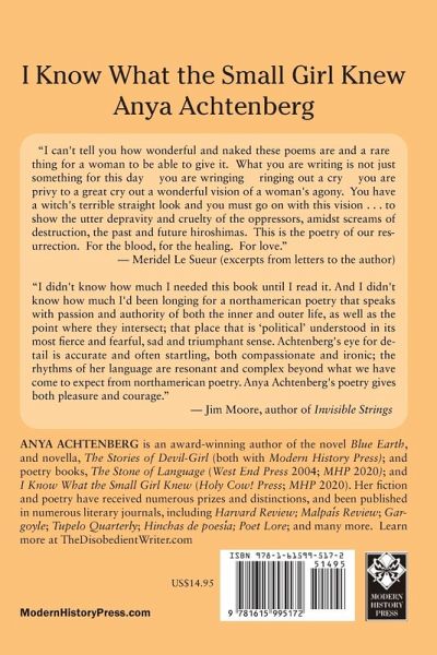 This early collection of Achtenberg's poetry treats the intersection of the inner and the outer life through issues of social justice that remain crucial, and the ways history and its traumas sit in us. Her themes include women's rights, poverty, war, racism, and sexual abuse. Her vision of concern spans the world, from her own inner city neighborhoods to the wider world, anywhere people are oppressed."I can't tell you how wonderful and naked these poems are and a rare thing for a woman to be able to give it. What you are writing is not just something for this day you are wringing ringing out a cry you are privy to a great cry out a wonderful vision of a woman's agony. You have a witch's terrible straight look and you must go on with this vision . . . to show the utter depravity and cruelty of the oppressors, amidst screams of destruction, the past and future hiroshimas. This is the poetry of our resurrection. For the blood, for the healing. For love." -- Meridel Le Sueur (excerpts from letters to the author)"I didn't know how much I needed this book until I read it. And I didn't know how much I'd been longing for a northamerican poetry that speaks with passion and authority of both the inner and outer life, as well as the point where they intersect; that place that is 'political' understood in its most fierce and fearful, sad and triumphant sense. Achtenberg's eye for detail is accurate and often startling, both compassionate and ironic; the rhythms of her language are resonant and complex beyond what we have come to expect from northamerican poetry. Anya Achtenberg's poetry gives both pleasure and courage." -- Jim Moore, author of Invisible Strings ¿¿ANYA ACHTENBERG is an award-winning author of the novel Blue Earth, and novella, The Stories of Devil-Girl (both with Modern History Press); and poetry books, The Stone of Language (West End Press 2004; MHP 2020); and I Know What the Small Girl Knew (Holy Cow! Press; MHP 2020). Her fiction and poetry have received numerous prizes and distinctions, and been published in numerous literary journals, including Harvard Review; Malpai¿s Review; Gargoyle; Tupelo Quarterly; Hinchas de poesi¿a; Poet Lore; and many more. Learn more at www.Anya-Achtenberg.com From Modern HIstory Press www.ModernHistoryPress.com