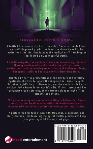 I know you did it. I know you killed them... Admitted to a remote psychiatric hospital, Sadie, a troubled teen and self-diagnosed psychic, believes she doesn't need to be institutionalized. Not that it stops the medical staff from keeping her locked up under careful watch. As Sadie navigates the confines of her new surroundings, intense therapy sessions with a doctor she doesn't trust, new medications, and the erratic personalities of the other residents, her special abilities begin to unveil a disturbing truth. Haunted by horrific premonitions of the murders of her fellow inpatients, she tries to ignore the supposed intrusive thoughts. But when a girl's body is discovered, and the death is ruled as a suicide, Sadie knows in her gut it's a lie. If she's correct and her prophetic dreams are true, then someone plans to pick off the residents one by one. With time running out and no one willing to believe her, Sadie must trust her troubled mind with a determined resolve to discover who the killer is before she ends up their next victim. A perfect read for fans of Karen M. McManus, E. Lockhart, and Holly Jackson, this tense psychological thriller promises to keep you guessing until the very last page. Get your copy of I Know You Killed Them today and discover the shocking new thriller everyone is talking about!