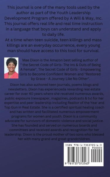 I Lead With Authority Because I Can This journal is one of the many tools used by the author as part of the Youth Leadership Development Program offered by A Will & Way, Inc. It's a blueprint to help young men prepare for adulthood while experiencing their time as adolescents and into their teen years. This journal offers real life and real time instruction in a language that boys can understand and apply tp daily life. At a time when teen suicide, teen killings and mass killings are an everyday occurrence, every young man should have access to this tool for survival. The journal is designed so that teens would be proud to carry it on their person or keep it on their nightstand. Writing is very therapeutic as it calms you down while forcing one to think. The journal will encourage youth to write out their thoughts, help to analyze social situations while building self esteem.