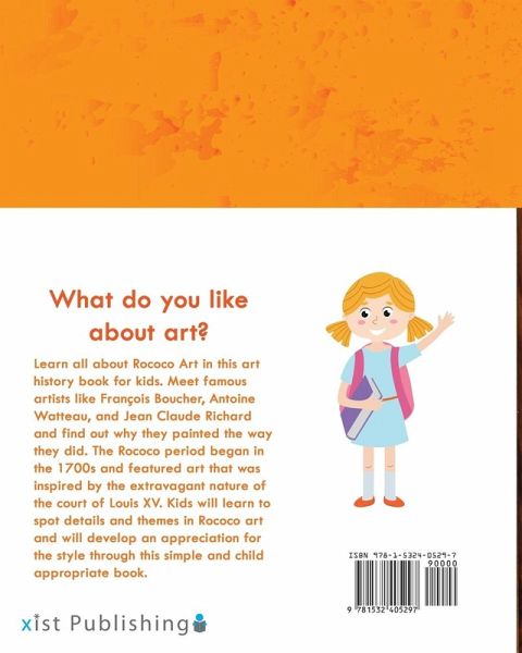 Art history made accessible and enjoyable for kids Learn all about Rococo Art in this art history book for kids. Meet famous artists like François Boucher, Antoine Watteau, and Jean Claude Richard and find out why they painted the way they did. The Rococo period began in the 1700s and featured art that was inspired by the extravagant nature of the court of Louis XV. Kids will learn to spot details and themes in Rococo art and will develop an appreciation for the style through this simple and child appropriate book. Here's a sample page from the book: Rococo art is a very important and unusual genre. The art styles before and after the Rococo style were very serious and formal. Rococo art is light and playful. It shows fun scenes of the rich people of that day, or playful angels or mythological characters. This small turn to light and fun art is unique to the Rococo style. This is why Rococo art is so interesting and is still appreciated today.