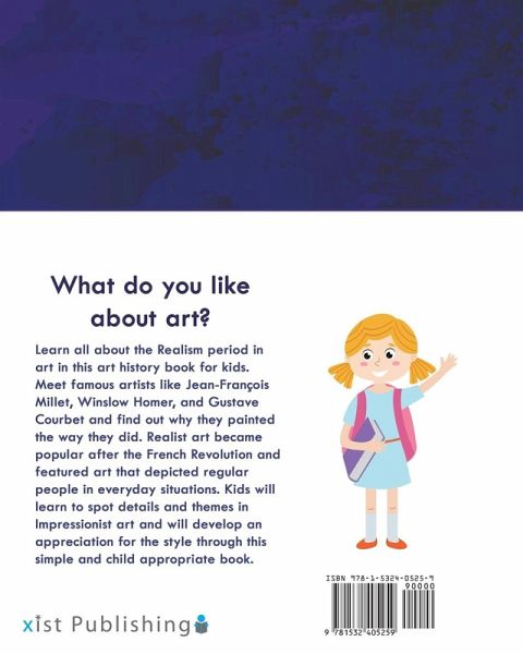 Art history made accessible and enjoyable for kids Learn all about the Realism period in art in this art history book for kids. Meet famous artists like Jean-François Millet, Winslow Homer, and Gustave Courbet and find out why they painted the way they did. Realist art became popular after the French Revolution and featured art that depicted regular people in everyday situations. Kids will learn to spot details and themes in Impressionist art and will develop an appreciation for the style through this simple and child appropriate book. Here's a sample page from the book: Look at the dark browns, oranges, and black tones of this painting of a farmer and his animals. This is an example of Realism. Realism is the artistic style or genre that shows people and their lives in a real way that tells the truth about life.