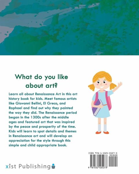 Art history made accessible and enjoyable for kids Learn all about Renaissance Art in this art history book for kids. Meet famous artists like Giovanni Bellini, El Greco, and Raphael and find out why they painted the way they did. The Renaissance period began in the 1300s after the middle ages and featured art that was inspired by the peace and prosperity of the time. Kids will learn to spot details and themes in Renaissance art and will develop an appreciation for the style through this simple and child appropriate book. Here's a sample page from the book: Raphael is a very important Renaissance painter. He was the son of a painter, and learned how to paint when he was very young. As he grew up in the art world of Italy, he became inspired by artists like Leonardo Da Vinci [duh-VIN-chi] and Michelangelo [mick-uhl ANJ-eh-low]. Raphael was a major Renaissance artist because of his beautiful Madonna portraits.