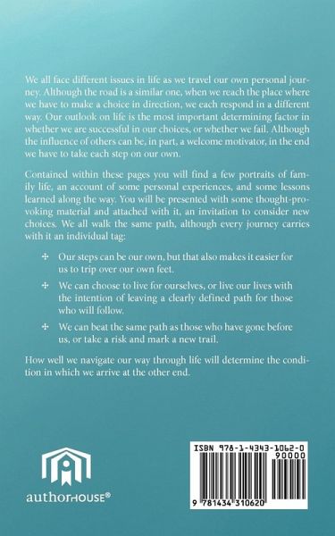 We all face different issues in life as we travel our own personal journey. Although the road is a similar one, when we reach the place where we have to make a choice in direction, we each respond in a different way. Our outlook on life is the most important determining factor in whether we are successful in our choices, or whether we fail. Although the influence of others can be, in part, a welcome motivator, in the end we have to take each step on our own. Contained within these pages you will find a few portraits of family life, an account of some personal experiences, and some lessons learned along the way. You will be presented with some thought-provoking material and attached with it, an invitation to consider new choices. We all walk the same path, although every journey carries with it an individual tag: Our steps can be our own, but that also makes it easier for us to trip over our own feet. We can choose to live for ourselves, or live our lives with the intention of leaving a clearly defined path for those who will follow. We can beat the same path as those who have gone before us, or take a risk and mark a new trail. How well we navigate our way through life will determine the condition in which we arrive at the other end.