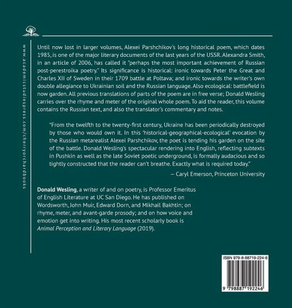 Longlisted for the 2024 PEN Award for Poetry in Translation, this prize-winning historical-lyrical poem of 1985, on the unequal power-relations between Russia and Ukraine, darkly resonates in 2023. Alexei Parshchikov's long historical poem, which dates 1985, is one of the major literary documents of the last years of the USSR. Alexandra Smith, in an article of 2006, has called it "perhaps the most important achievement of Russian post-perestroika poetry." Its significance is historical in its irony towards Peter the Great and Charles XII of Sweden in their 1709 battle at Poltava and towards the writer's own dual allegiance to Ukrainian soil and the Russian language. While all previous translations of parts of the poem are in free verse, translator Donald Wesling here carries over the rhyme and meter of the original whole poem. To aid the reader, this volume contains the Russian text, and also the translator's commentary and notes.
