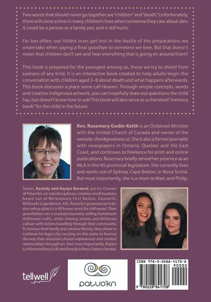 Two words that should never go together are "children" and "death." Unfortunately, there will come a time in many children's lives when someone they care about dies. It could be a person or a family pet, and it still hurts. Far too often, our littlest ones get lost in the bustle of the preparations we undertake when saying a final goodbye to someone we love. But that doesn't mean that children don't see and hear everything that is going on around them! This book is prepared for the youngest among us, those we try to shield from sadness of any kind. It is an interactive book created to help adults begin the conversation with children aged 3-8 about death and what happens afterwards. This book discusses a place some call Heaven. Through simple concepts, words and creative Indigenous artwork, you can hopefully draw out questions the child has, but doesn't know how to ask! This book will also serve as a cherished "memory book" for the child in the future.