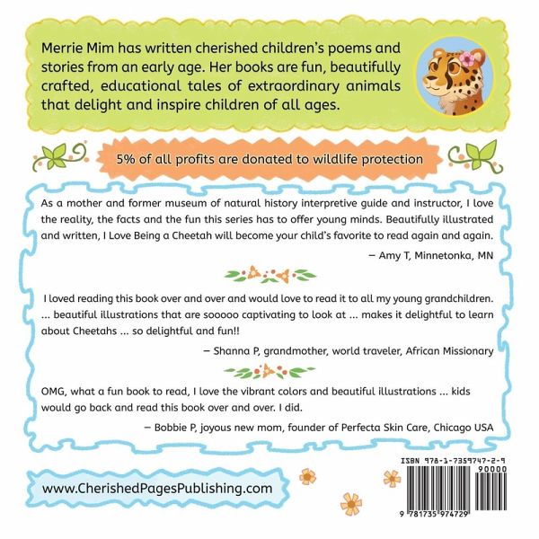 Do the kids in your life LOVE cats? BIG cats? With fun-to-read rhyming text and vividly lush illustrations, early readers are enticed into the big cat world of the wild African cheetah! (comes with FREE Coloring Pages!) With fun-to-read rhyming text and vividly lush illustrations, early readers are enticed into the big cat world of the wild African cheetah! An imaginative early reader experience, ages 3-5, engages visual, auditory, thinking parts of the mind, this book is fun! It is lovingly crafted, educational and encourages nurturing feelings towards animals with a special page on "How to Love a Cheetah". "I loved reading this book over and over ...beautiful illustrations that are sooooo captivating to look at!" Shanna P. grandmother of 11, African Missionary "OMG, what a fun book to read!... I love the vibrant colors and beautiful illustrations ! " Bobbie P. new mom! "I love the reality, the facts and the fun this series has to offer young minds, beautifully illustrated and written..." Amy T. former Museum of Natural History interpretive guide & instructor "I think the book is fun, colorful, and appealing with a gentle environmental lesson." Serene T., marvelous elementary school teacher This is Book 1 of the "I LOVE BEING!" series, preschool readers get to:Feel what it's like to be a cheetah! See where cheetahs live ! See what they love to do ! Do they have families? Do they like to chase things? Are they like your favorite kitty? A special page on "How to Love a Cheetah" sweetly encourages nurturing feelings towards animals and care for our environment. Supports healthy early development and enrichment for growing minds.
