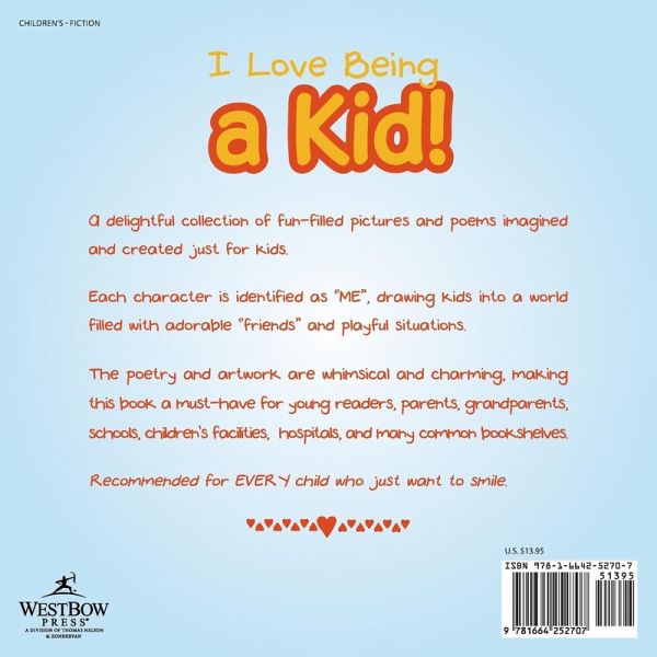 A delightful collection of fun-filled pictures and poems imagined and created just for kids. Each character is identified as "ME", drawing kids into a world filled with adorable "friends" and playful situations. The poetry and artwork are whimsical and charming, making this book a must-have for young readers, parents, grandparents, schools, children's facilities, hospitals, and many common bookshelves. Recommended for EVERY child who just want to smile.