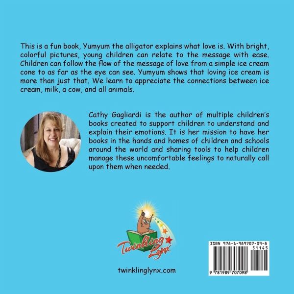 One of the latest books in the Yumyum series by Best-Selling Children's Author, Cathy Gagliardi's. This beautiful story will be a lovely addition to your child's library and quickly become a favorite of theirs and yours. 'I Love Ice Cream' is a fun book of Yumyum the alligator explaining what love is. With bright, colourful pictures, young ones can relate to the message with ease. Children can follow the flow of the message of love from a simple ice cream cone to as far as the eye can see. Yumyum shows that loving ice cream is more than just that. We learn to appreciate the connections between ice cream, milk, a cow, and all animals. Loving a farmer for taking care of the cow extends to loving all people. As we are shown the link between us and plants, earth, water, and the sun, we see how much they are a part of the whole cycle and our entire lives. Yumyum shows us how we can never be alone when we're all connected through love. Help the little ones use their imagination and try making an equally fun story. This also works with eggs. Other books in the Yumyum series include:Bellyflies Gonna Build a Boat Mother Love Chocolate Egg Willow