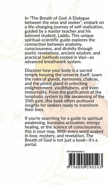 The Breath of God: Awakening Through Flesh and Spirit In this rare and transformative work, a loving soul guiding Other souls, on a sacred journey that bridges spiritual enlightenment and scientific anatomy. Through heartfelt dialogues and deep revelations, the reader is shown how the human body itself holds the keys to immortality, divine light, and cosmic oneness. Combining ancient wisdom with modern understanding, The Breath of God uncovers the hidden truths about chakras, glandular systems, Vasi breathing, and the legendary 10th Gate. Readers will discover how disciplines like Surya Kalai (Sun Phase) and Chandra Kalai (Moon Phase) ignite inner transformation - purifying the rivers of blood, lymph, and glymph - to unlock the full potential of the human body and spirit.