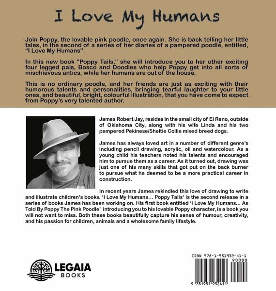 Join Poppy, the lovable pink poodle, once again. She is back telling her little tales, in the second of a series of her diaries of a pampered poodle, entitled, "I Love My Humans".In this new book "Poppy Tails," she will introduce you to her other exciting four legged pals, Bosco and Doodles who help Poppy get into all sorts of mischievous antics, while her humans are out of the house.This is no ordinary poodle, and her friends are just as exciting with their humorous talents and personalities, bringing tearful laughter to your little ones, and beautiful, bright, colourful illustration, that you have come to expect from Poppy's very talented author.