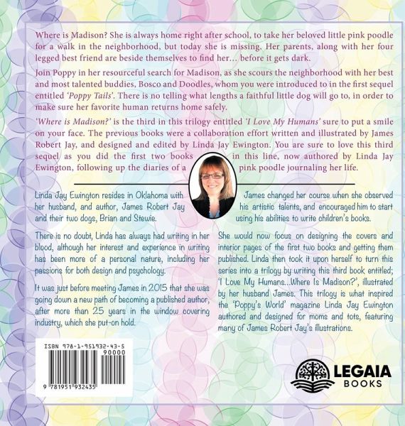 'Where is Madison?' is the third in this trilogy entitled 'I Love My Humans' sure to put a smile on your face. The previous books were a collaboration effort written and illustrated by James Robert Jay, and designed and edited by Linda Jay Ewington. You are sure to love this third sequel as you did the first two books in this line, now authored by Linda Jay Ewington, following up the diaries of a pink poodle. LiveJournal of her life.