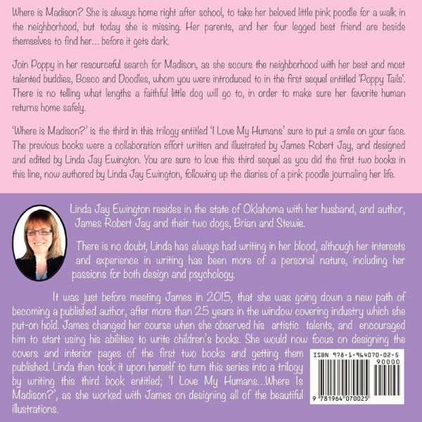 Where is Madison? She is always home right after school, to take her beloved little pink poodle for a walk in the neighborhood, but today she is missing. Her parents, along with her four legged best friend are beside themselves to find her... before it gets dark.Join Poppy in her resourceful search for Madison, as she scours the neighborhood with her best and most talented buddies, Bosco and Doodles, whom you were introduced to in the first sequel entitled 'Poppy Tails'. There is no telling what lengths a faithful little dog will go to, in order to make sure her favorite human returns home safely. 'Where is Madison?' is the third in this trilogy entitled 'I Love My Humans' sure to put a smile on your face. The previous books were a collaboration effort written and illustrated by James Robert Jay, and designed and edited by Linda Jay Ewington. You are sure to love this third sequel as you did the first two books in this line, now authored by Linda Jay Ewington, following up the diaries of a pink poodle journaling her life.